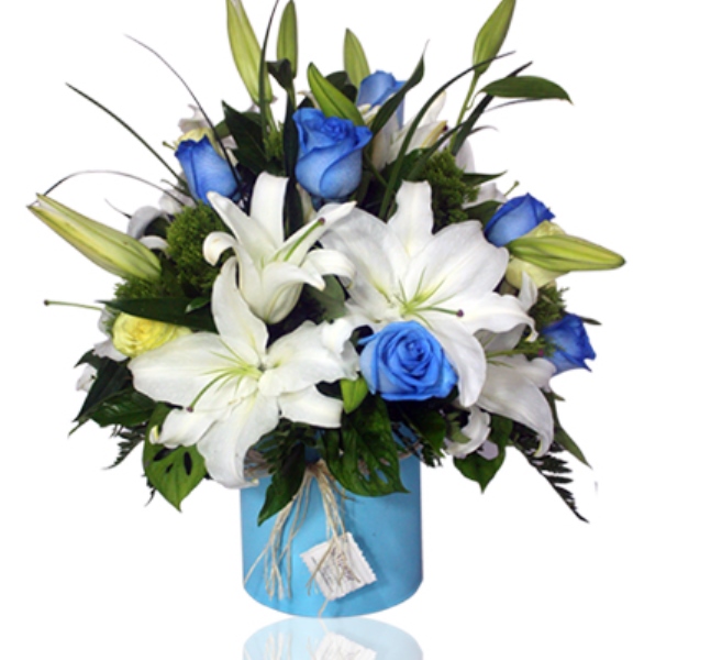 Arreglo floral de rosas azules y lilium blancos decoradas con finos follajes incluye tarjeta dedicatoria